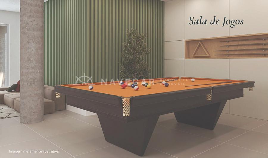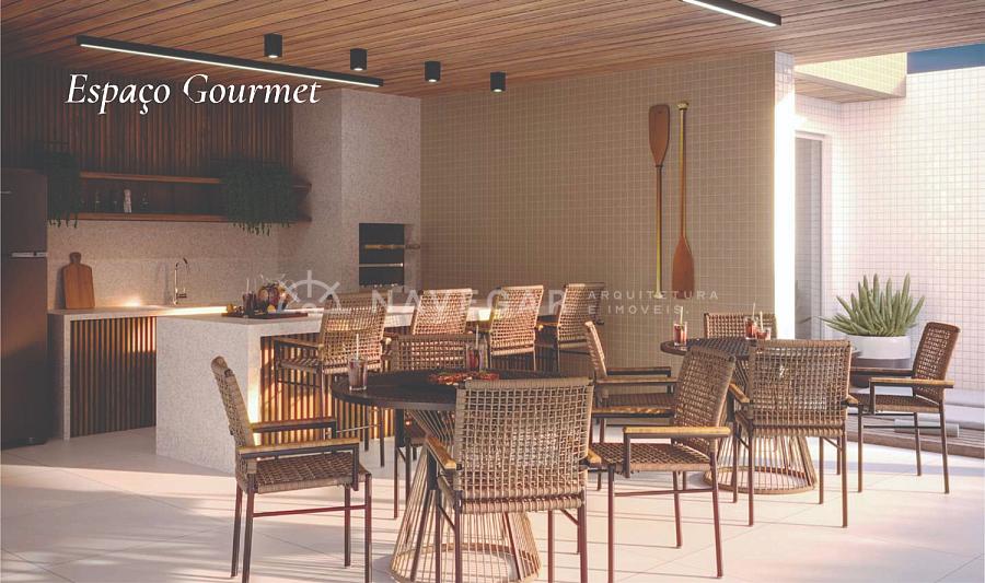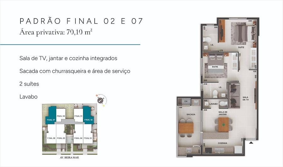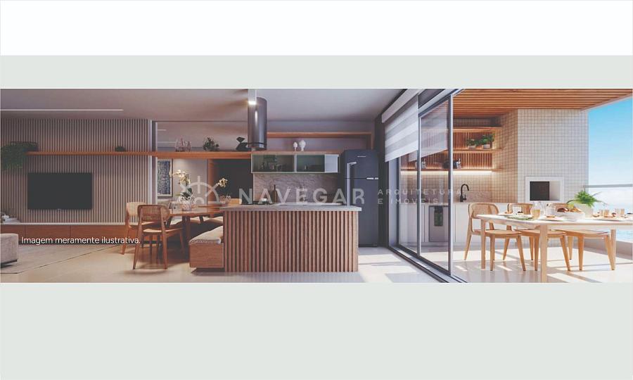 2 suítes + 1 lavabo; sala de estar, jantar e cozinha integrados, ampla sacada com churrasqueira a carvão e 1 vaga de garagem.