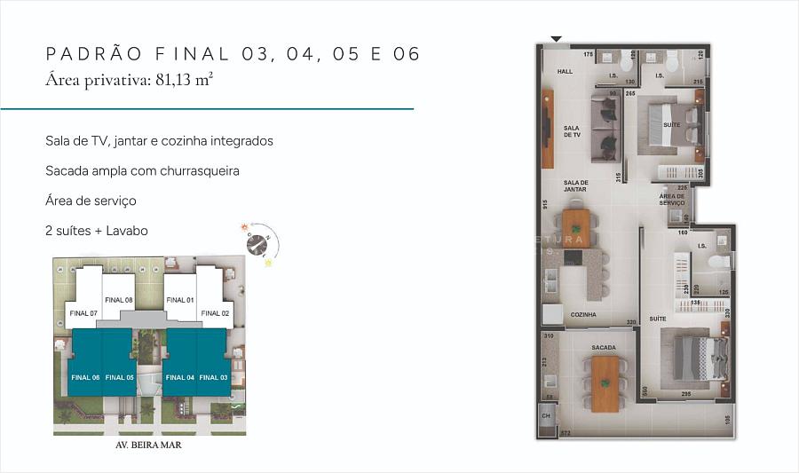 2 suítes + 1 lavabo; sala de estar, jantar e cozinha integrados, ampla sacada com churrasqueira a carvão e 1 vaga de garagem.