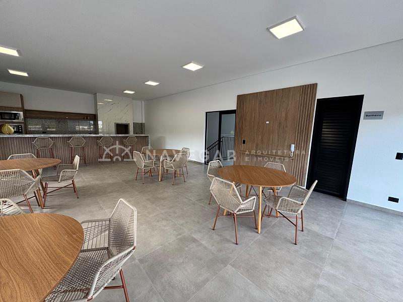 A primeira torre (B) já foi concluída e entregue. Lindo salão de festas na área comum com móveis projetados, espaço externo amplo para relaxar ao lado da piscina.