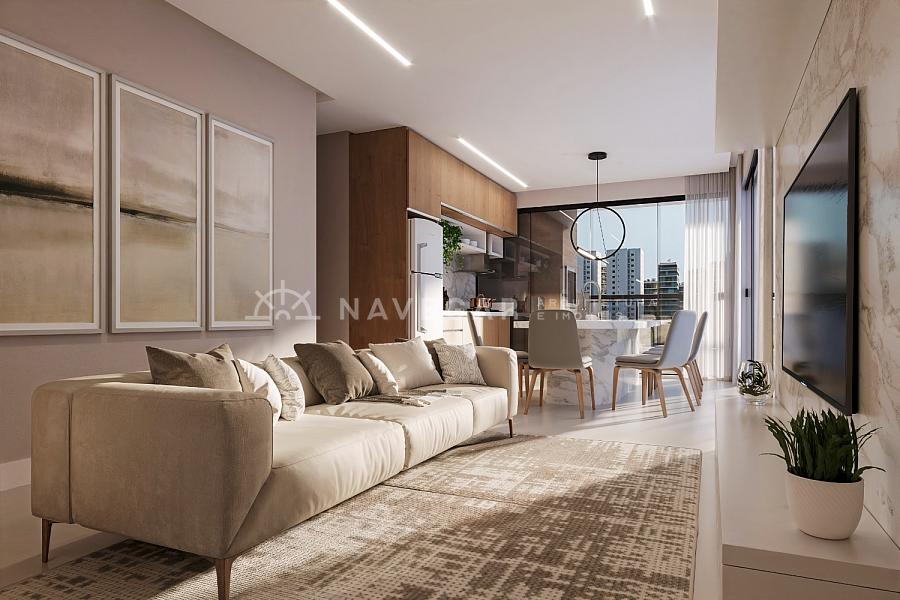 • Sala e cozinha integradas em conceito aberto, criando ambientes modernos e funcionais.
