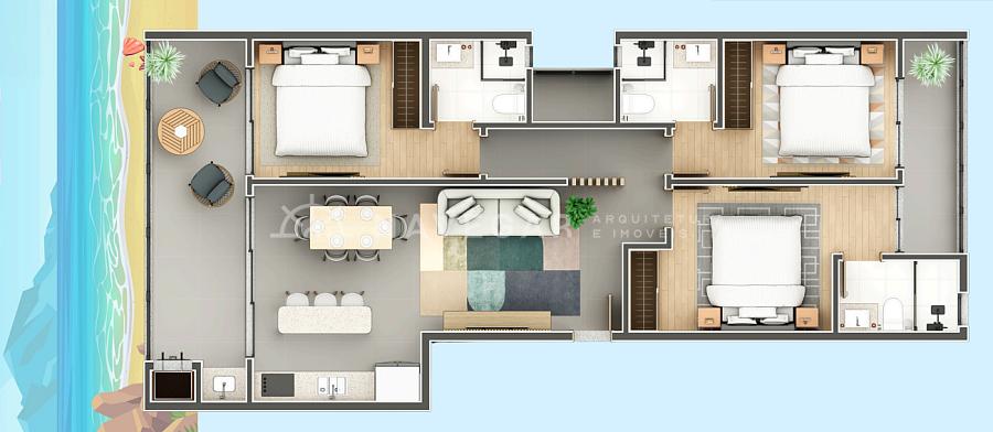 Todas as unidades contam com 3 suítes, projetada para proporcionar qualidade de vida à beira mar.