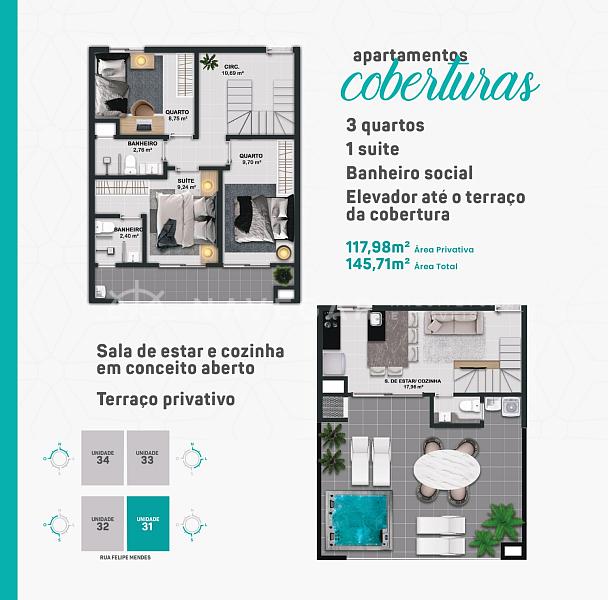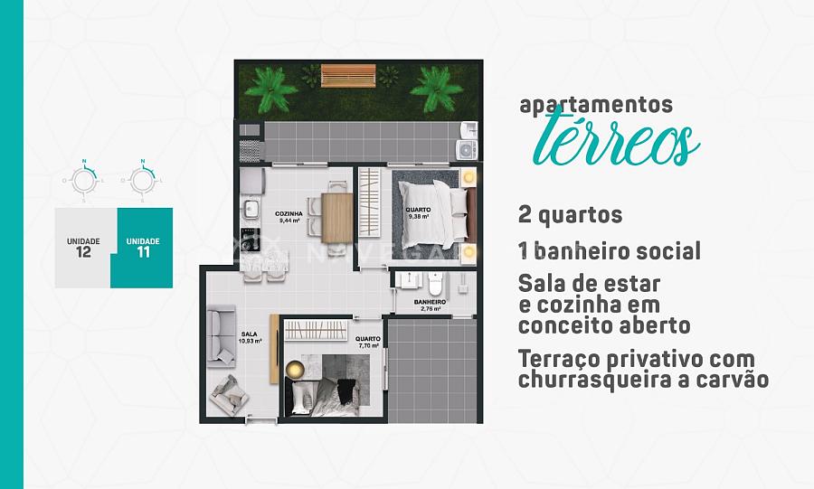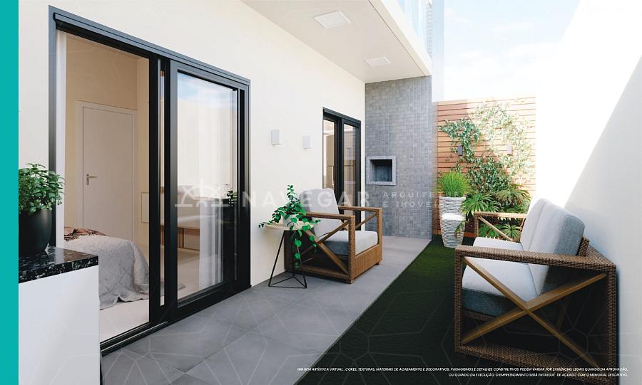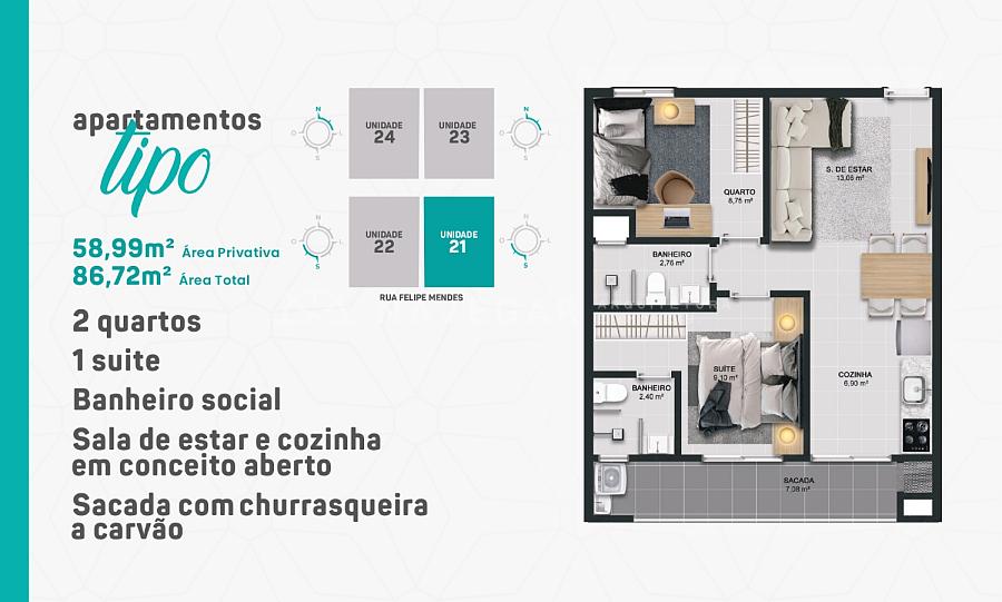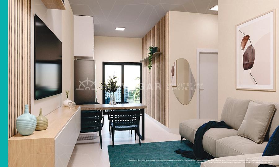 Conta com 2 quartos (sendo 1 suíte), sacada com churrasqueira a carvão, além de ambientes de estar/ jantar/ cozinha em conceito aberto.