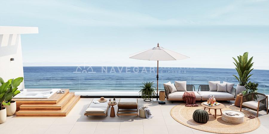 A unidade do presente anúncio é a 302, que conta com 4 suítes (sendo uma com closet), rouparia, sala de estar/ jantar/ cozinha integradas, churrasqueira, área de serviço, sacada e terraço descoberto. A unidade fica de frente para o mar, com vista panorâmica da praia.