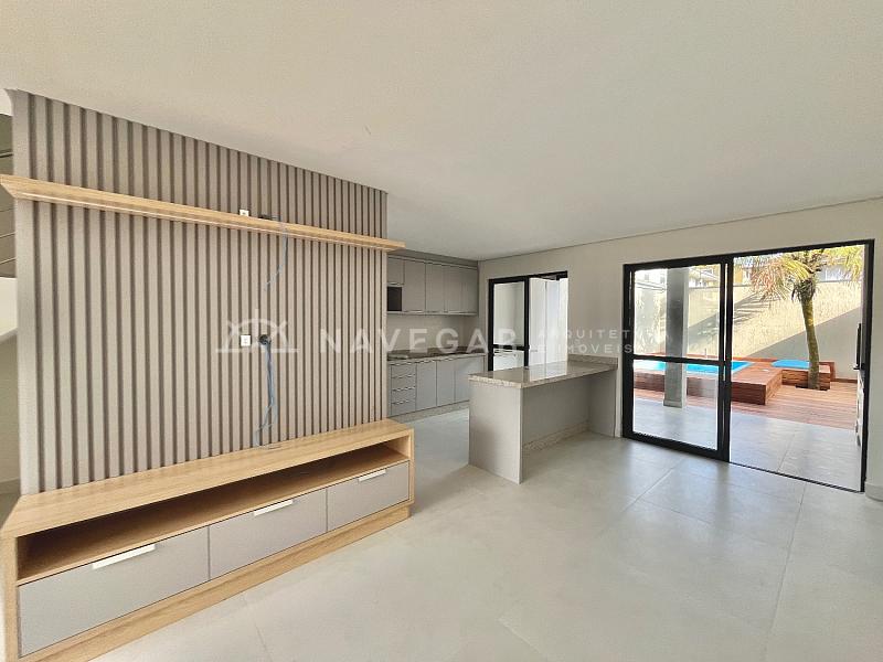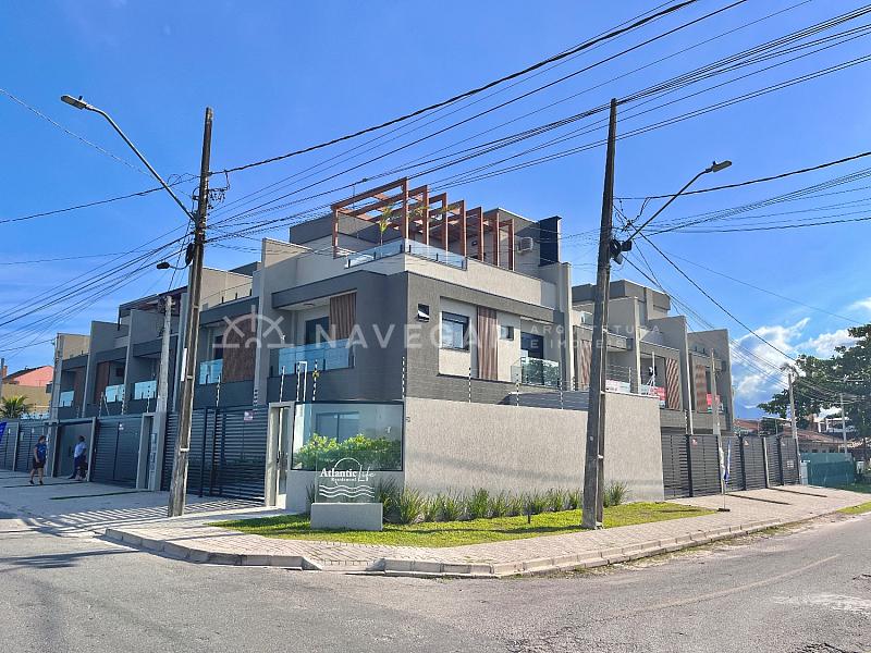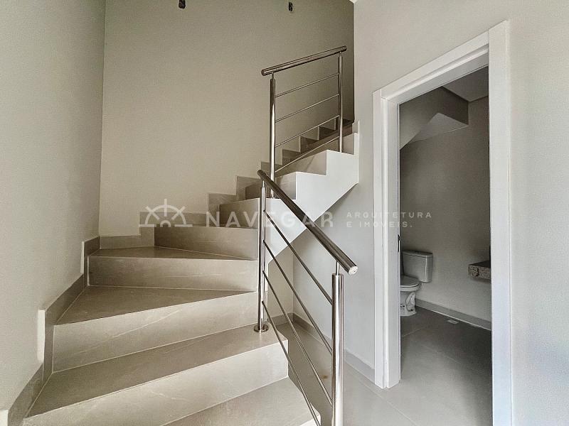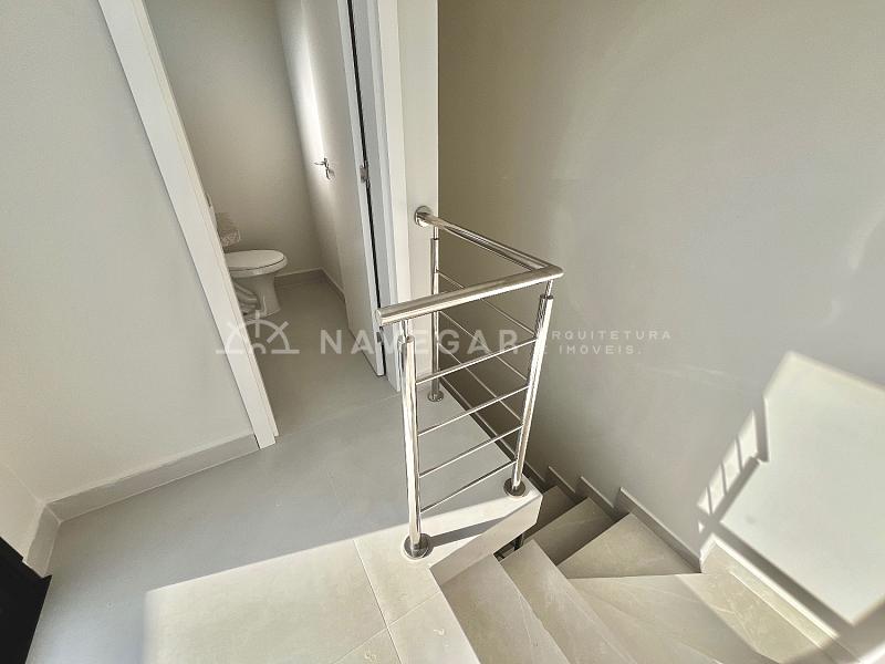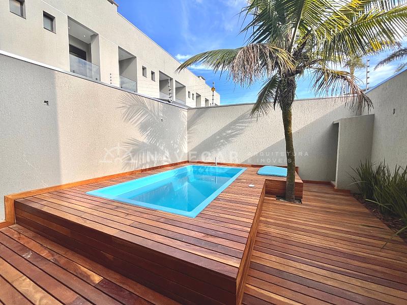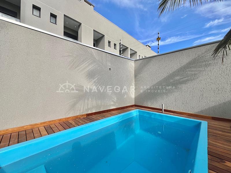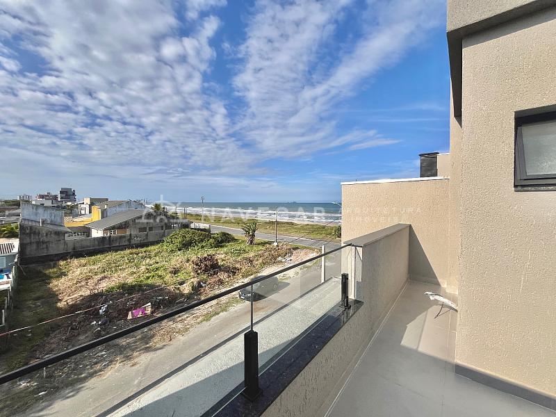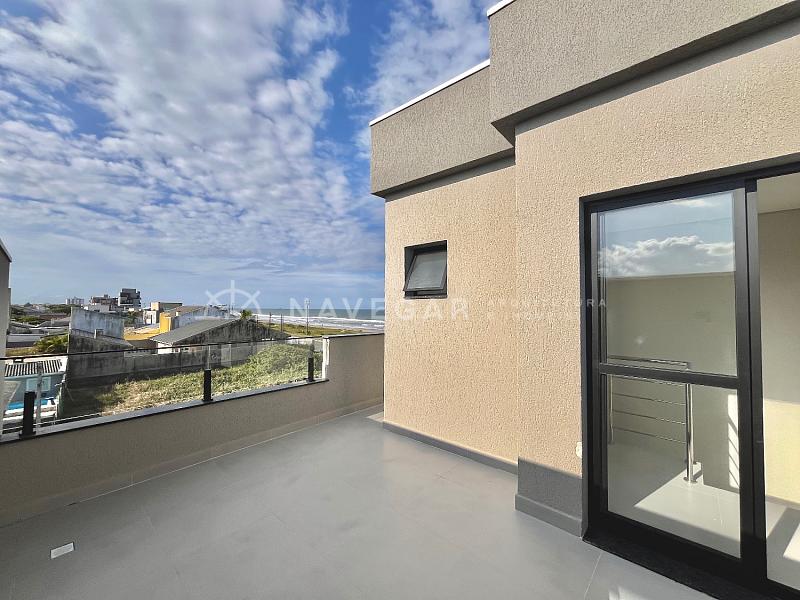 Contém: 03 dormitórios, sendo 01 suíte master com sacada, banheiro social, 02 lavabos, terraço com vista para o mar no piso superior (mais um cômodo que pode ser utilizado para quarto, sala íntima ou home-office) sala de estar, jantar e cozinha em ambientes integrados, churrasqueira a carvão, piscina privativa, lavanderia com armários, depósito e 02 vagas de garagem.